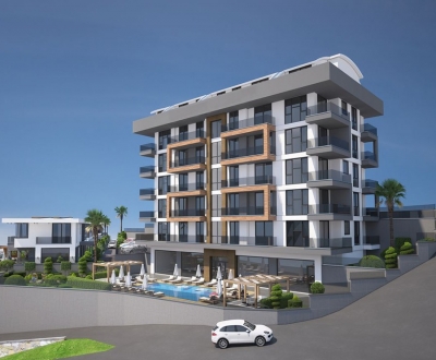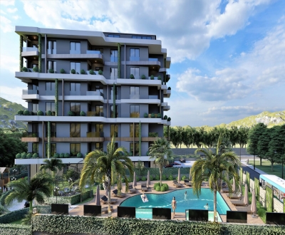 Stylish 1+1 apartment offering sea and mountain views in Avsallar, Alanya. Features pool, fitness, sauna, and more.