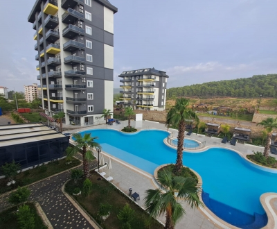 Modern 1+1 apartment offering mountain views in Alanya, with pool, fitness, and sauna facilities